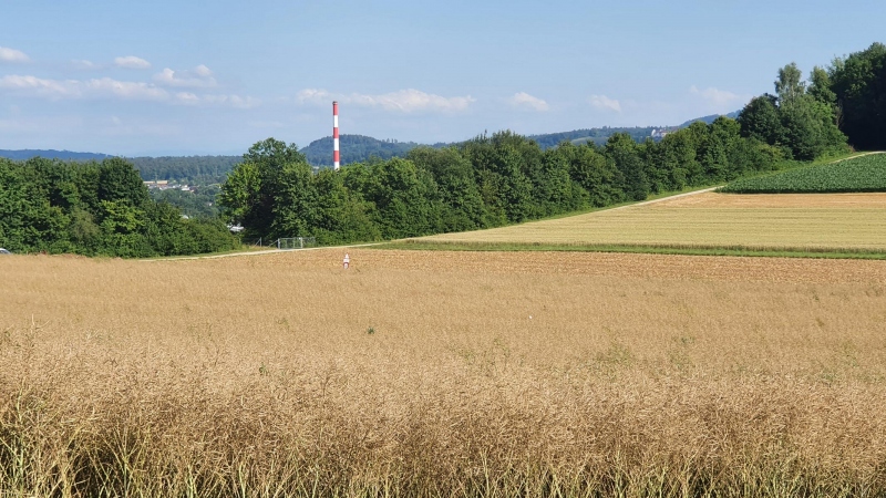 Vorne das Rapsfeld und im Hintergrund der Hochkamin, wohl von der Jurament-Fabrik in Holderbank. Scheinbar mitten im Rapsfeld die Verkehrstafel der Durchgangsstrasse von Auenstein nach Veltheim. Für Insider: hinter dem Wald befindet sich eine Kiesgrube.