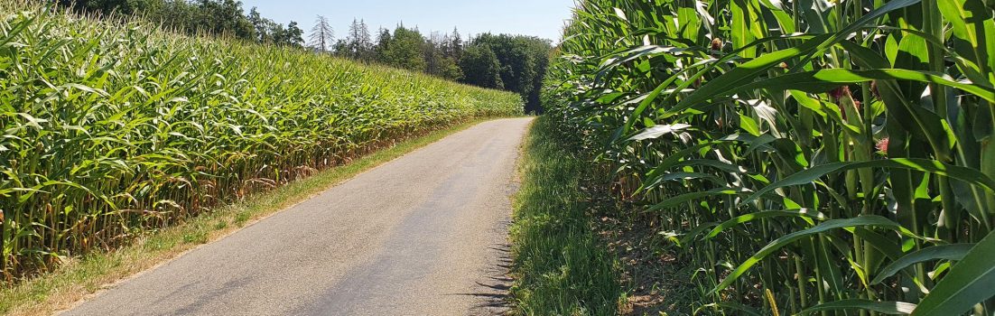 Der Radweg führte oft an abgeschnittenen Getreidefeldern vorbei. An manchen Stellen verdeckten die mannshohen Maisfelder die Sicht.