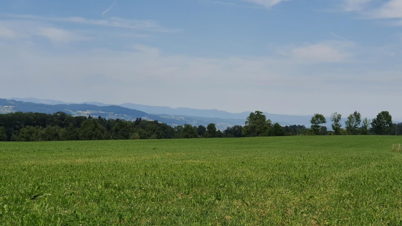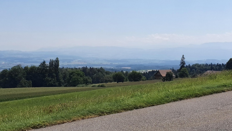 Nicht nur für das Handy, auch von blossem Auge ist der Alpenkamm kaum zu erkennen. Die Luft muss wohl sehr dunstig sein. Möglicherweise ist am Fusse der hintersten Hügelkette der Zugersee, links von der einzelnen Tanne, gerade noch erkennbar.