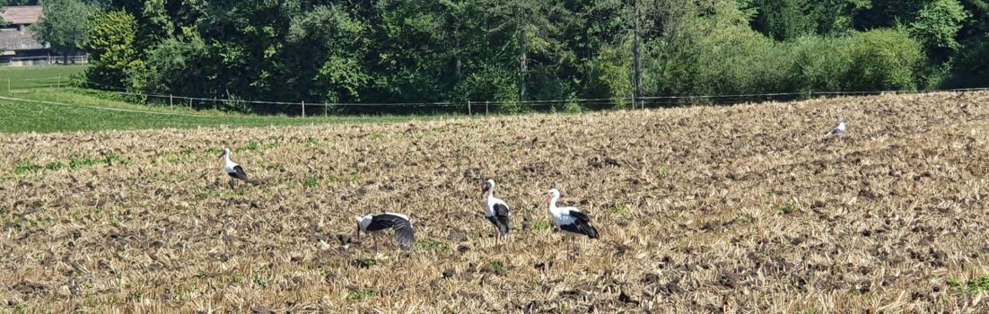 Kaum einer pickte etwas vom Boden auf. Alle standen einfach da, schauten in die gleiche Richtung, kaum einer bewegte sich. Gerade so, als ob sie auf ein Zeichen am Himmel warten würden. Waren sie abflugbereit für ihre lange Reise in den Süden? Jungstörche würden ja normalerweise etwa im August abfliegen. Obiges Bild ist übrigens nur ein Ausschnitt der ganzen Storchenschar.