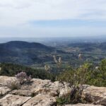 Am Morgen gibt sich das Wetter noch etwas kühl. Erst recht am Ende der Stichstrasse nach Llaberia hinauf. Der höchste Punkt liegt immerhin auf knapp 700 Metern über Meer. Doch die Fahrt dort hinauf und wieder zurück zur Hauptstrasse ist recht schön. Das Wetter gestattet eine gute Fernsicht. Die Strasse schlängelt sich mal links und mal rechts von der Krete in die Höhe. So hat man die Möglichkeit einerseits über die Ebene bis zum Meer zurück zu schauen und andererseits auch in das eher felsige Hinterland.