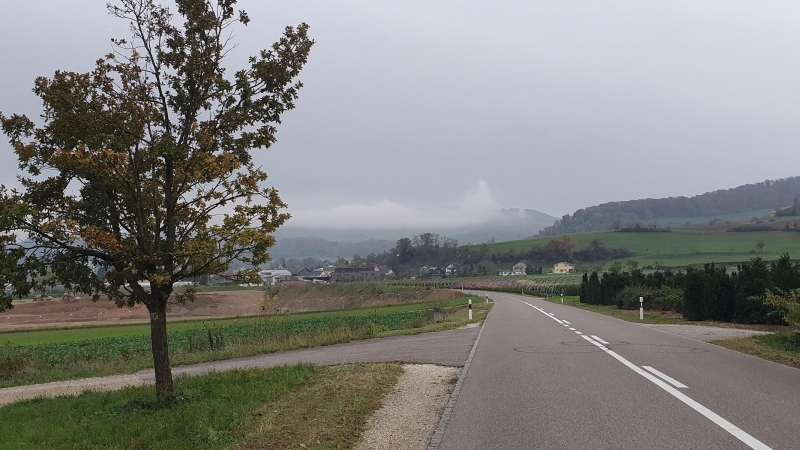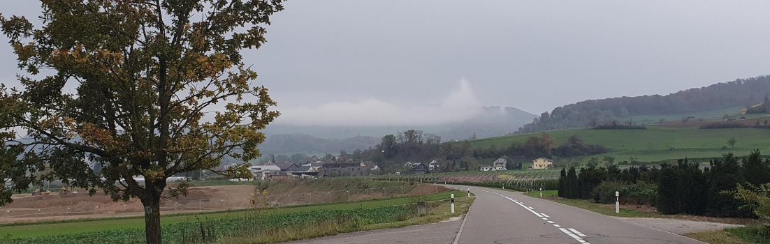Als ich aus dem Wald komme, tropft es gerade nicht mehr. Etwas weiter vorne ist sogar die Strasse wieder trocken. Ich halte vorläufig an meiner Idee für die heutige Runde fest. Fahre hinüber nach Brunegg, dann hinunter ins Aaretal.