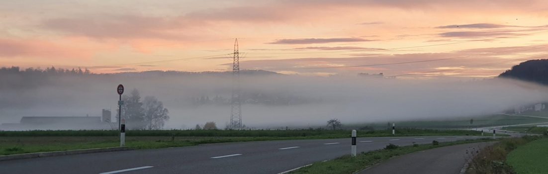 Etwas mehr Glück hatte ich später bei der Fahrt entlang dem Villigerfeld, zwischen Remigen und Riniken. Vom Wald am rechten Bildrand schob sich gerade eine Nebelbank, ähnlich einem Gewässer, auf das Feld hinaus. Auch da hatte ich nicht besonders viel Zeit, denn der Nebel löste sich rasch mehr und mehr auf.