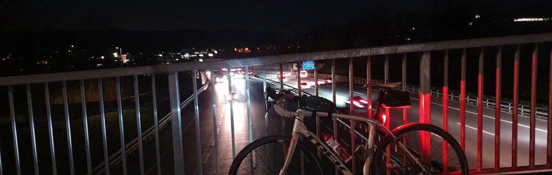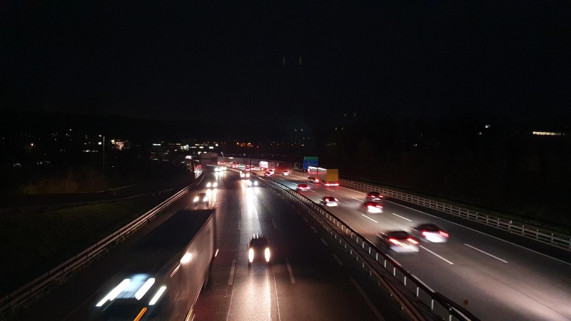 Hier bei der Überfahrt auf dem Radweg über die A1 von Wettingen nach Neuenhof. Im Hintergrund die Lichter von Baden.