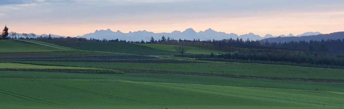 Oberhalb Hägglingen sieht man nach einer breiten “Hochebene” in Richtung der Alpen. Dazwischen liegt natürlich nicht nur das Bünztal, sondern noch eine ganze Reihe weiterer Hügel und Täler der Voralpen.