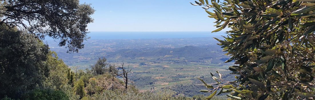 Heute, am 1. Mai, an dem viele Spanier einen Ausflug machen, ist sogar das Restaurant beim Aussichtspunkt von La Mussara offen. Direkt vom Restaurant gibt es einen schönen Blick in die Ebene hinunter und weiter bis zum Meer.