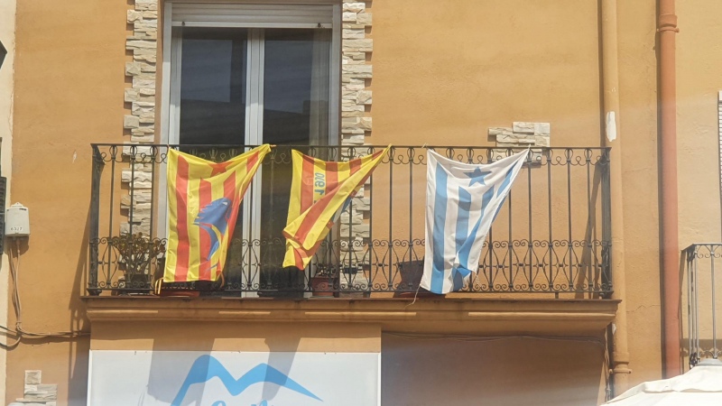 Ein Dorf, das mich immer wieder überrascht mit seinen Fahnen. Die katalanische Fahne ist klar, dass die hierher gehört, aber mit zusätzlichen Symbolen oder Schriftzügen? Oder gar in den Farben blau/weiss? Dafür hängt am Kirchturm gleich neben an, eine Fahne in den Farben rot/gelb, ohne den Stern am oberen Ende. Die Länge der Fahne reicht vom Glockenstuhl bis wenige Meter über die Strasse.