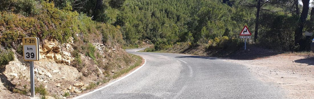 Unterstützt von etwas Rückenwind fuhren wir über die Ebene, am Anfang etwa parallel zum Meer, nach ein paar Kilometern durch Olivenbäume und ein paar Mandelbäume über die Ebene hinauf, bis an den Eingang der Schlucht nach Pratdip. Es wurde enger, steiler und kurviger. Der Aufstieg zum Coll de Fatxes hatte begonnen.