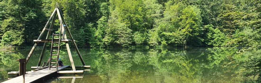 Eingebettet in einer Waldlichtung, fast vollständig umgeben von Wald, ein paar Feuerstellen befinden sich auch an seinem Ufer. Dazu weiter vorne irgendwie passend eine Wasserstelle.