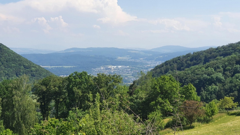 Bevor man im Wald verschwindet, gibt es noch einen schönen Ausblick hinunter in Richtung Aarau und Aaretal. Das Wetter ist heute sehr dunstig, sonst könnte man wohl problemlos bis hinüber an den Alpenkamm sehen.