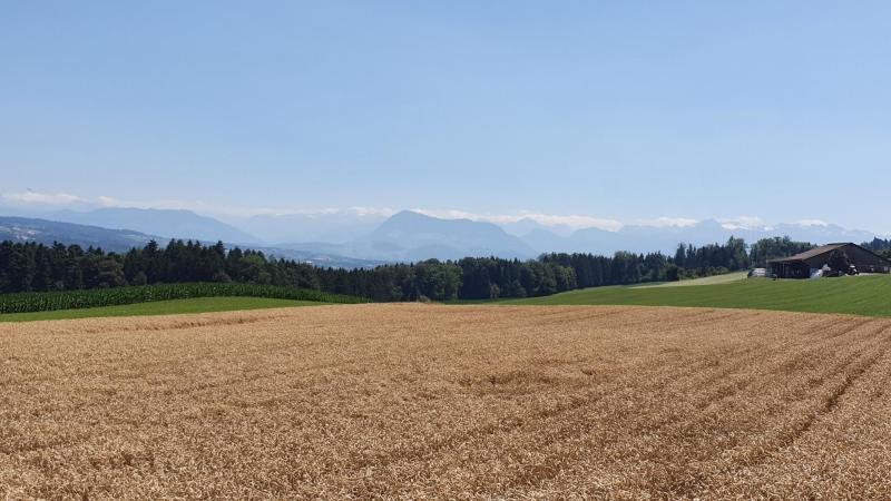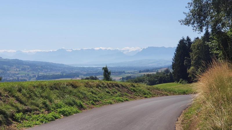 Bald nach Wiliberg, es geht schon wieder ein bisschen hinunter in Richtung Suhrental, wurde ich von einem schönen Panorama überrascht. Etwa in der Bildmitte der Sempachersee und dahinter der Alpenkamm.