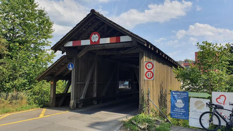 Eine eher kleine und schmale Brücke, mit allen möglichen Beschränkungen. Die Fussgänger werden auf einem separaten Gang über den Steinerkanal, wohl einem ehemaligen Wasserzubringer für die frühere Spinnerei, geführt.