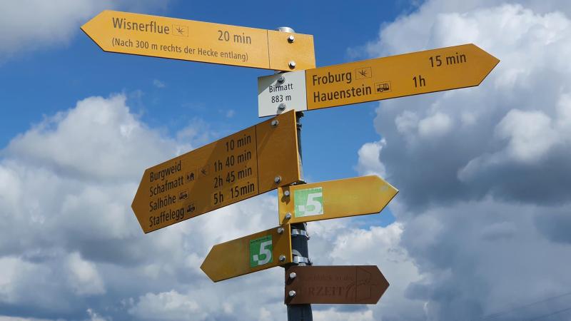 Vorbei am Schloss Wartenfels. Der Weg war als Wanderweg markiert, die Strasse geteert. Jedenfalls bis zum Besucherparkplatz des Schlosses. Danach ging es durch den Wald, auf einer hartgewalzten, gleichmässig ansteigenden Kiesstrasse. Nur selten gaben die Bäume den Blick frei, hinunter ins Aaretal.
