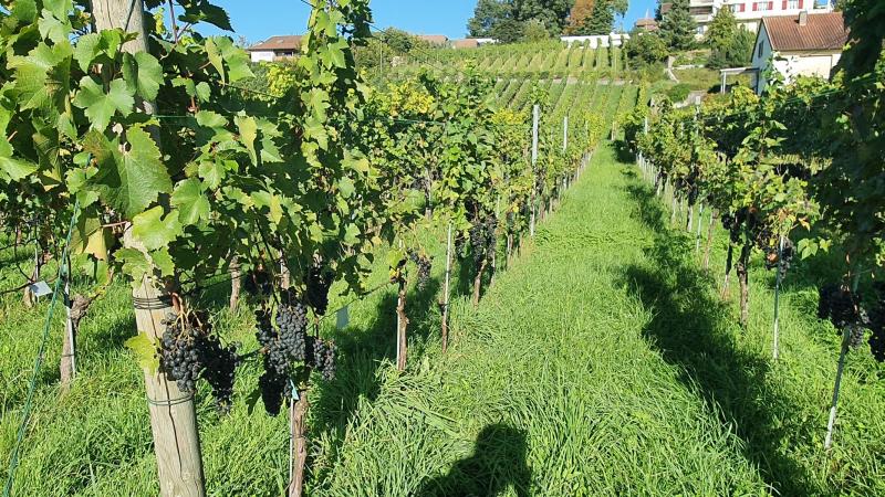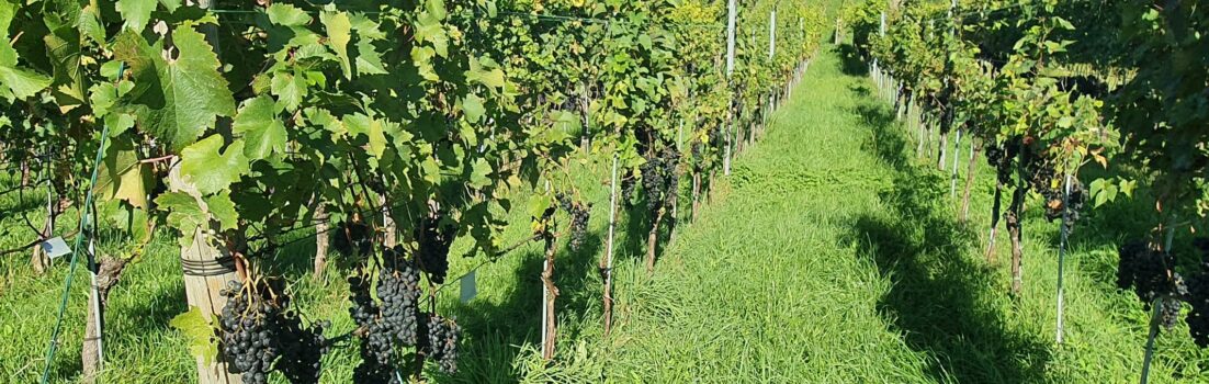 Hier hängen die Trauben noch an der Sonne unter dem Grün der Reben.