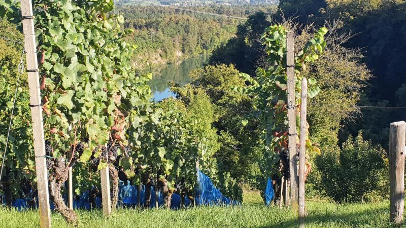 Auf der Höhe bei Böttstein gibt es einen schönen Ausblick auf die Aare hinunter. Noch hängen hier die Trauben an den Reben.
