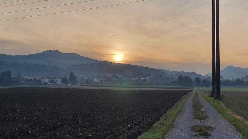 Abendstimmung über Veltheim, das könnte vielleicht ein Sujet sein. Ich musste auf dem Kiesweg noch etwas in Richtung der Sonne fahren, damit die Drähte der Überlandleitung nicht gerade mitten durch das Bild hängen.