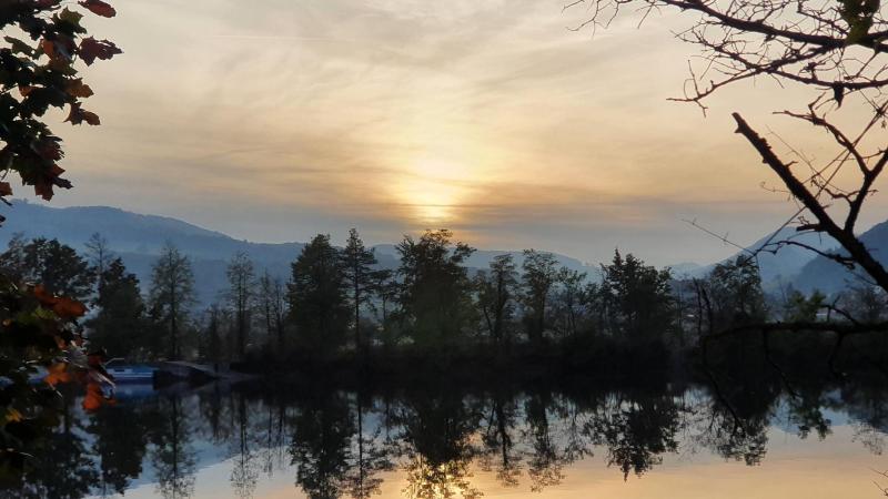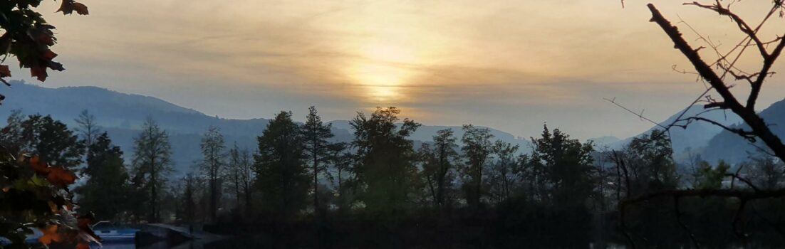 Ein paar Kilometer weiter vorne, wieder direkt an der Aare, gelingt mir doch noch ein schönes Abendbild. Der Nebel, der die Sonne immer mehr verdeckt, die Hügelzüge eines kleinen Teiles des Juras und die Spiegelungen der Bäume im stillen Wasser des Aarekanals.