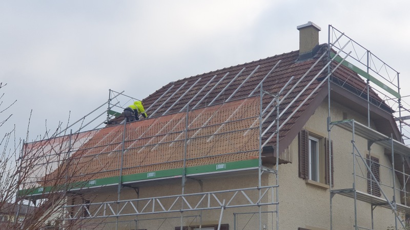 Anfang November wird das Haus eingerüstet und das Dach für die Montage der Panels vorbereitet.