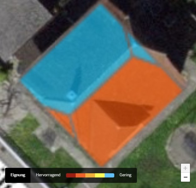 Die klassische Südseite des Hausdaches hat nur einen ganz kleinen Anteil am Dach. Die Ausrichtung der beiden Dachhälften in eine eher südöstliche, beziehungsweise südwestliche Ausrichtung ist etwas ungünstig. Zudem ist die bessere Dachhälfte noch mit einem Erker unterbrochen.