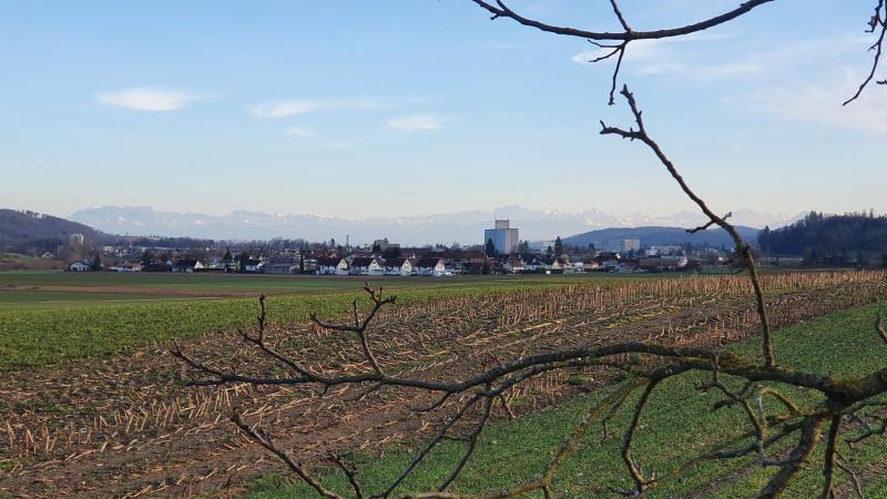 Später wendete ich mit einer grossen Schlaufe hinüber in Richtung Suhr und gelangte so auf den Radweg 34, den altern Bernerweg. Es ging bereits zurück. Kurz vor Othmarsingen der Blick das Bünztal hinauf in Richtung der Alpen.