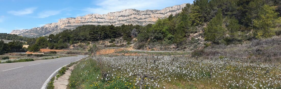 Nach dem Pass geht es durch ebenso langgezogene Kurven ins Tal hinunter, wo wir bald abzweigen und den nächsten Hügel in Angriff nehmen. Die Strasse führt uns hinauf und an den Fuss der Sierra de Montsant.