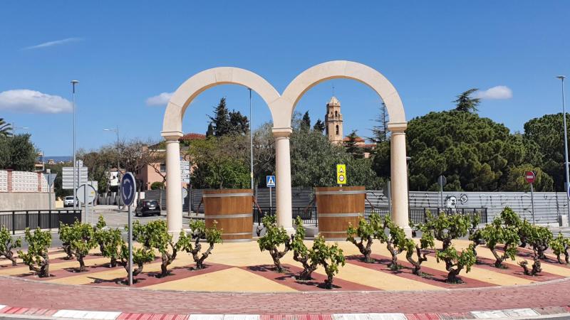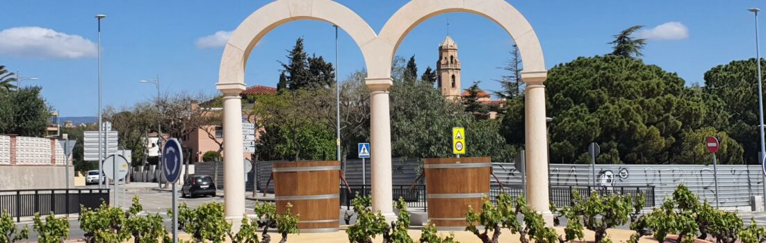 Der Strassenkreisel der eigentlich schon den Namen des Dorfes enthält. “Vinyols”, die Rebenstöcke im Vordergrund, und “els Arcs”, die Bögen, die Arkaden über den Weinfässern.
