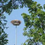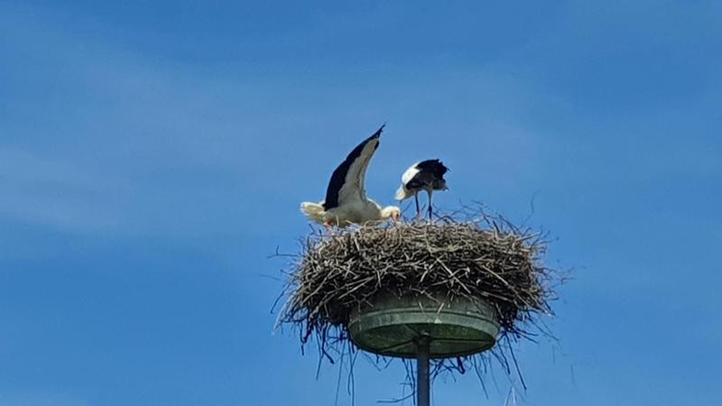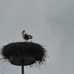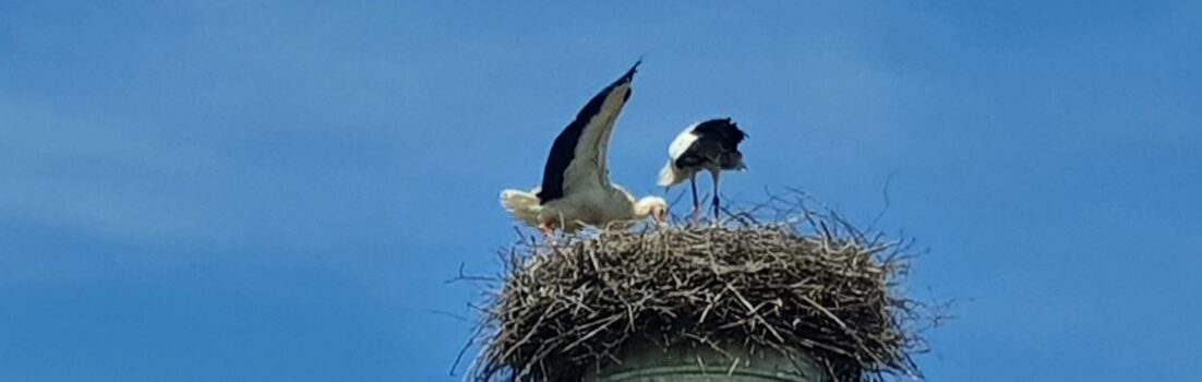 Ich nehme an, dass der eingetroffene Storch mit einer Portion Futter für die Jungen eingetroffen ist und sich der andere seinerseits nun auf Futtersuche begab. Wie viele Jungtiere sich im Nest befinden kann ich von unten nicht sehen. Da sind in den nächsten Wochen weitere Besuche notwendig, wenn die Jungen dann selber mal stehen können und sich vielleicht am Nestrand zeigen. Immerhin: das Nest ist wieder bewohnt und die beiden Störche gehen “elterlichen Aufgaben” nach.