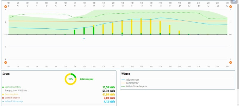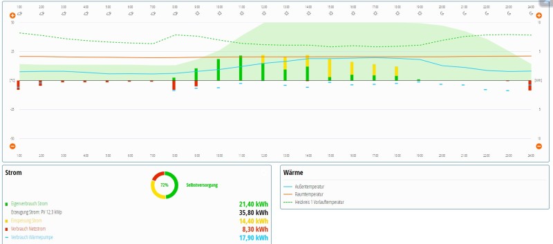 Einen ersten Höhepunkt erreichte die Anlage am 22.03., als zum ersten Mal mehr Strom produziert wurde, als wir verwendet haben. Dass dennoch die Selbstversorgung nur 72% erreichte, hängt damit zusammen, dass die Nacht speziell kalt war, der Strom aus dem Akku für die Wärmepumpe nicht reichte, und deshalb doch etwas Netzstrom bezogen werden musste.