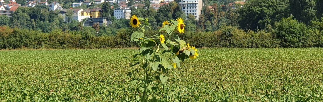Oft findet man dabei Gewächse vom letzten Jahr, die das ganze beackern und Neuaussäen irgendwie durchgestanden haben. Meist sind es Sonnenblumen. In anderen Fällen habe ich auch schon Maispflanzen gesehen.