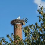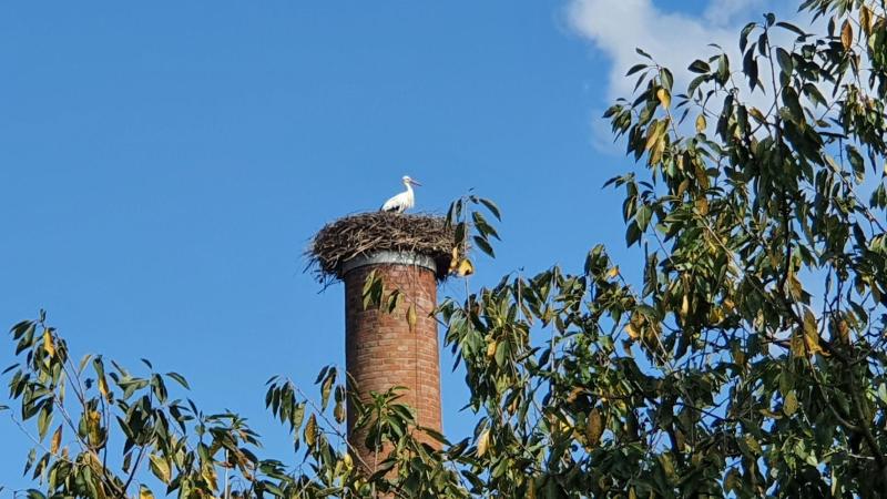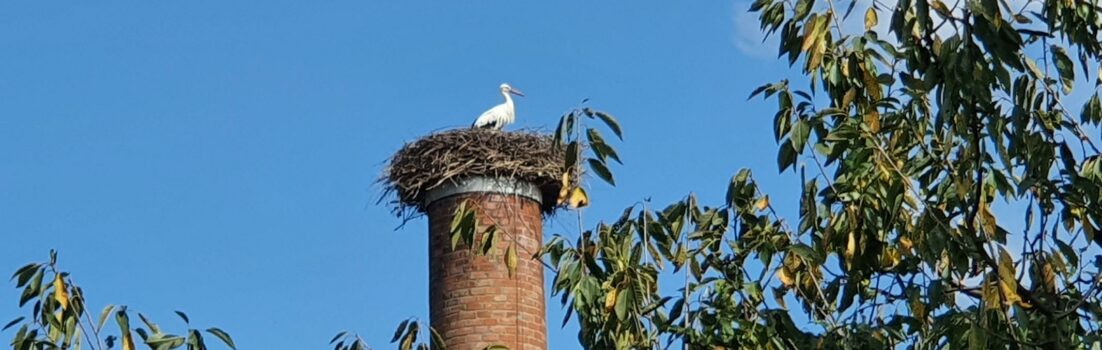 Auch hier stand nur einer der beiden auf seinem Nest auf dem Hochkamin, schaute mal links, mal rechts. Seine Gefiederpflege hatte er wohl schon hinter sich.