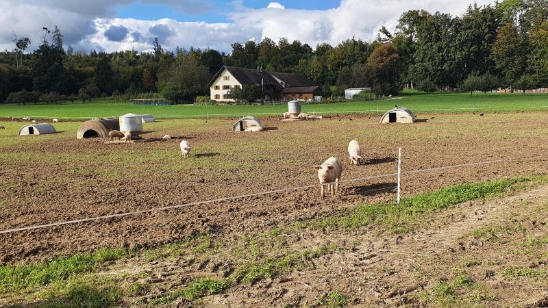 Schon fast idyllisch kam mir die Situation auf obigem Bild vor. Die freilebenden Schweine auf ihrem eingezäunten Feld, mit den Häuschen, Wasser und Futtertrögen. Ab und zu stösst eines der noch jungen Schweine an den elektrisch geladenen Zaun, was dann regelmässig zu einem heftigen Gequitsche und einem Endspurt ins Feld zurück führt.