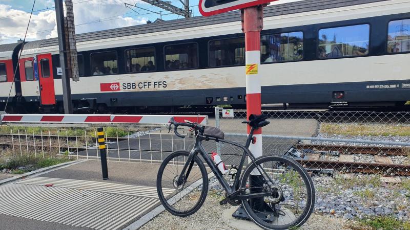 Fast am Schluss der Runde noch eine Wartezeit, bis der Güterzug, hinter dem vorbeifahrenden Schnellzug, auch noch den Bahnübergang frei gemacht hat.