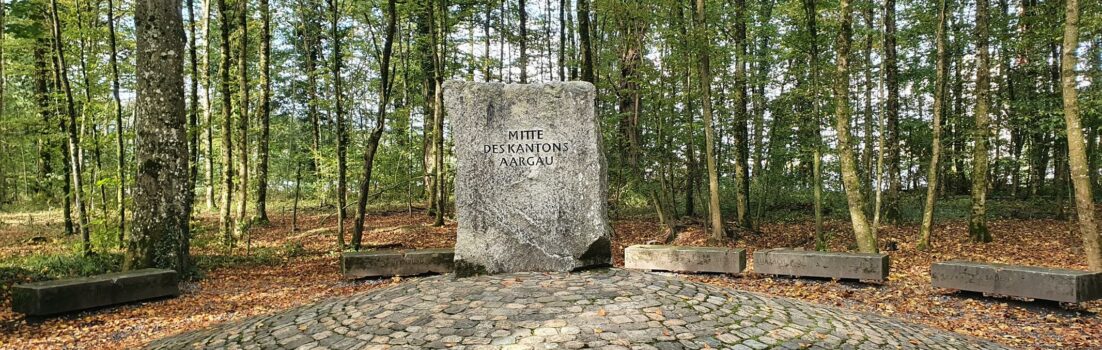 So kurbelte ich heute wieder einmal quer über das Bünztal nach Lenzburg, dann durch die Quartiere nach Niederlenz und gelangte schon bald in den Wald mit dem Denkmalstein für die Kantonsmitte. Noch ein paar Meter laubbedeckte Kiesstrasse und ich war da.