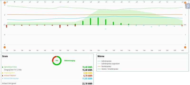 Der 6. November war für die Stromproduktion ein recht guter Tag. Die Sonne schaffte den Durchbruch durch die Nebeldecke bereits vor der Mittagszeit. Der Himmel war danach den ganzen Tag ziemlich wolkenlos. Bereits um 10:00 hat die Stromproduktion eingesetzt, der Akku kann bis gut 40% gefüllt werden. Wegen der kühlen Aussentemperatur von 10 Grad, läuft auch die Wärmepumpe (kleine blaue Strichlein). Kurz nach 17:00 ist die Stromproduktion in den Panels beendet. Ab 18:00 beziehen wir für den Rest des Tages den Strom wieder aus dem Netz.