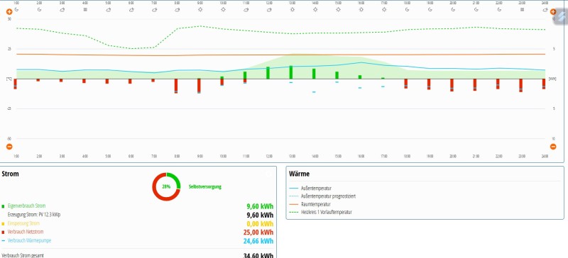 Kurz vor Mitte September, nach mehreren kalten Tagen und Nächten, sank auch die Temperatur im Haus spürbar. Am 11. September weckte ich die Wärmepumpe aus der Sommerpause. Noch bis 26. September glichen sich Stromproduktion und Stromverbrauch trotz eingeschalteter Wärmepumpe ungefähr aus. Seit 27. September beziehen wir immer grösser werdende Teile unseres Stromverbrauches wieder aus dem Netz. Die Selbstversorgung sank von 100% während der Sommermonate auf durchschnittlich noch 52% seit Ende September bis zum aktuellen Tag. Tendenz weiter sinkend.