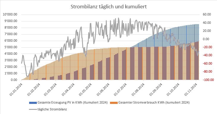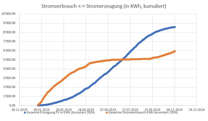 Ich bin gespannt, ob die Anlage über das ganze Jahr soviel Strom produzieren kann, wie das Haus auch während eines Jahres verbraucht. Nach diesem doch eher kühlen und nassen Frühling, und dem nun doch recht nebligen und vor allem auch wieder recht kühlen Herbst, dürfte das Erreichen dieses Zieles jedenfalls recht knapp werden.
