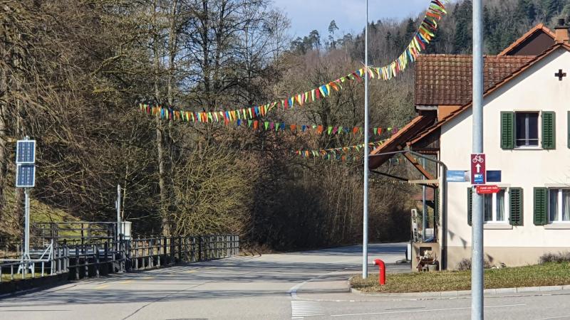 Nicht nur die farbigen Fähnchen über den Strassen, die man noch hie und da entdecken kann, zeugen von der Fasnacht. Auch in den Gärten oder sonst entlang der Strasse lassen sich immer wieder einzelne Fasnachts-Puppen entdecken.