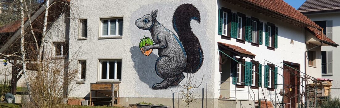Die Abfahrt hinunter an den Rhein führt durch den Wald. Im oberen Teil auch recht steil, in den Dörfern wird es dann flacher. Da fiel mir auch diese Wandmalerei auf: