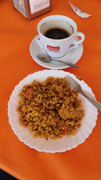 Wegen des etwas kühlen Wetters verzichteten wir auf ein kaltes Getränk, blieben beim Kaffee. Doch die Bar überraschte uns mit einer grosszügigen “kleinen Speise”. Normalerweise bestehen diese Tapas aus höchsten ein bis zwei kleinen Schalen, vielleicht mit Fisch, Kartoffeln, Eier, Oliven oder Ähnlichem, aber für den ganzen Tisch, nicht wie hier pro Person einen ganzen Teller voll Paella.
