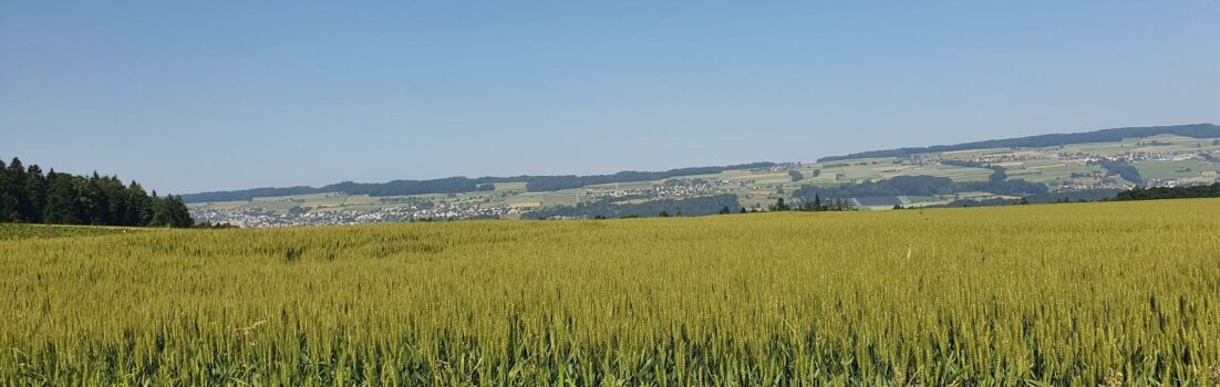 Aus dem Quartier, bald über das Birrfeld und hinunter ins Reusstal. Noch ist die Fernsicht schlecht. Jedenfalls ist von den Alpen am Ende des Reusstales nichts zu sehen. Nach Mellingen hinauf nach Tägerig und gleich weiter über den Hügel hinauf, vorbei an der Lourdeskapelle, nach Büschikon hinauf. Noch eine letzte Anstrengung und ich bin zuoberst.