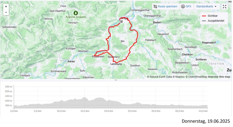 Abermals wartete ich auch heute bis in den späteren Nachmittag, um meine Runde zu beginnen. Ich suchte soweit möglich die schattigen Strecken. Zuerst im Reusstal nach Birrhard hinauf, dann über das südlichste Ende des Birrfeldes und entlang der Autobahn nach Mägenwil. Den höchsten Punkt überfuhr ich bereits kurz nach Mägenwil bevor es nach Othmarsingen hinunter geht. Nochmals ein kleiner Hügel und ich rollte schon bald nach Lenzburg hinein.