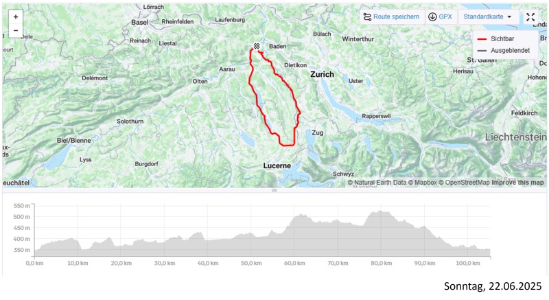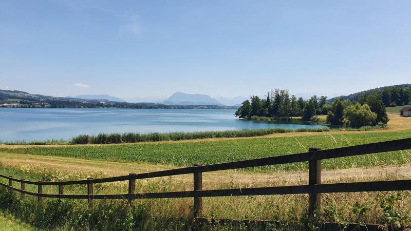 Markant in der Bildmitte die Rigi. Obwohl es wolkenlos ist, weht doch ein westlicher Wind. Für meine weitere Fahrt bedeutet das meist Seitenwind.