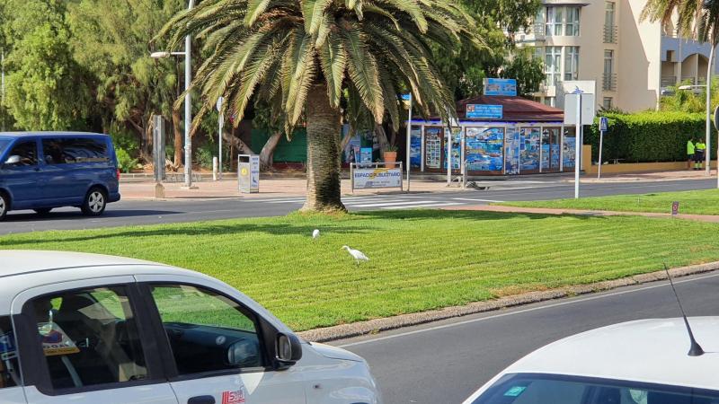 Kurz vor der Fähre genehmigten wir uns in der Stadt einen Kaffee. Dabei entdeckte ich auf dem Grasfleck, mitten in der Strasse, zwischen zwei recht gut befahrenen Strassen, bis zu vier Silberreiher, die sich manchmal sogar um die Futterstücke stritten.
