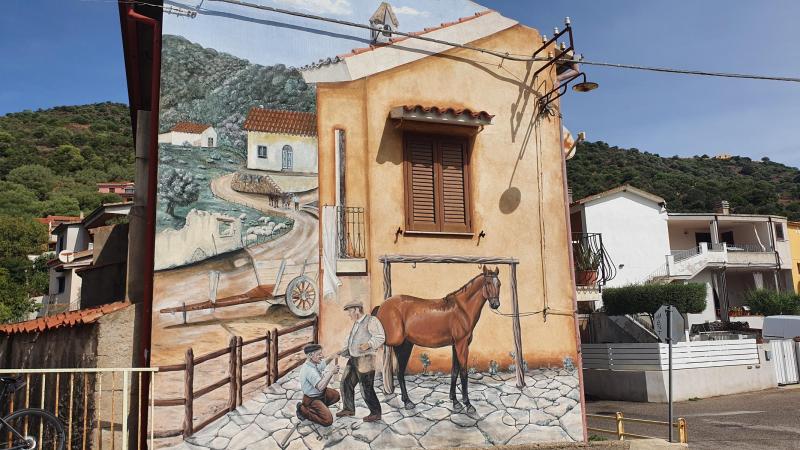 Manchmal sind es eher Personenbilder, wie man sie vielleicht in der Kirche finden kann, manchmal aber auch Situationen aus dem Dorf, vom Dorfplatz. Wie zum Bespiel hier: ein Pferd das beschlagen wird, Kühe auf der Strasse, Schafe, usw. Das alles füllt eine ganze Hausfassade. Das Fenster des Hauses ist diesmal sogar in ein aufgemaltes Gebäude integriert.