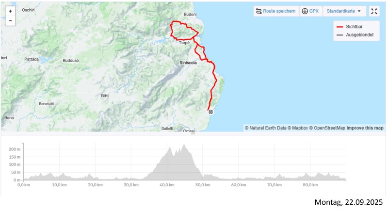 Für den Heimweg fahren wir nach der Runde wieder entlang der Küstenstrasse zurück ins Hotel. Die Strasse ist recht wellig, keine besonders steilen Abschnitte, aber während 20 Kilometern kaum eine ebene Phase. Ein stetes auf und ab. Heute sogar mit der besonderen Situation, dass der Rückenwind sich im Verlauf der Strecke zu einem Gegenwind umkehrt.