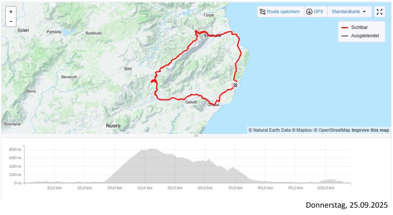 Der Herbst ist auch hier angekommen. Die ersten Kilometer auf der Küstenstrasse fühlen sich recht kühl an, trotz der Sonneneinstrahlung. Doch die Steigung auf 800 Meter über Meer, um den Monte Albo zu umrunden, heizt dann doch genügend ein.