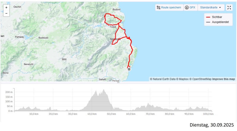 Nach Siniscola biegen wir nochmals für eine kurze Schlaufe ins Hinterland ab. An einer der Kreuzungen zeigt mein GPS eine “Unsicherheit”. Die eigentlich geplante Strecke scheint nur eine Zufahrt auf ein Werksgelände zu sein. Die richtige Strasse befindet sich vielleicht etwa 200 Meter weiter vorne.