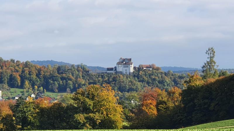 Das Schloss Wildegg trohnt über der Aare. Doch heute umrandet von einem Wald, der sich langsam die herbstlichen Farben überzieht. Im Hintergrund immer noch die Nebeldecke, die sich in den nächsten Minuten wohl noch ganz auflösen wird.