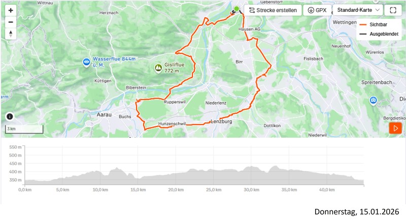 Ich fahre das Aaretal hinauf, kurzer Abstecher ins Schenkenbergertal, dann aber wieder zurück und bei Veltheim hinauf zur Kiesgrube. Dort gibt es immer wieder eine schöne Aussicht über das Aaretal und manchmal gar einen Blick bis hinüber zum Alpenkamm.