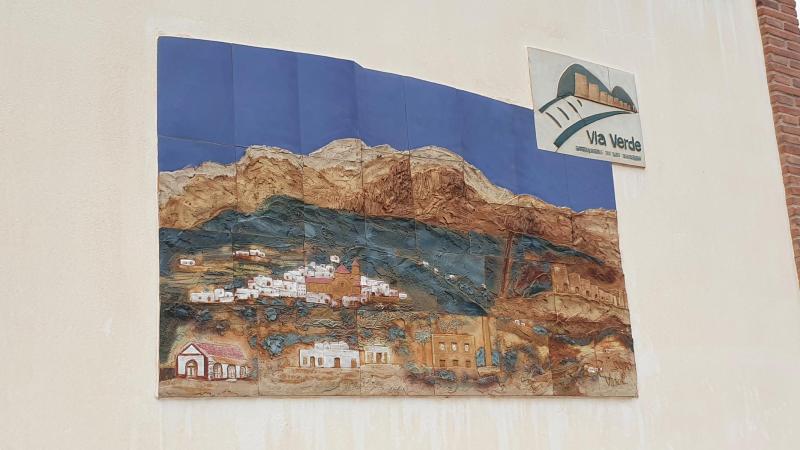 Ein Relief an der Aussenwand des Bahnhofes zeigt die Situation auf. Das Gebirge aus welchem das Eisenerz gewonnen wurde, das Dorf Lucainena de las Torres, rechts im Bild wieder die Schmelzöfen und unten ein paar Häuser denen man bei der Abfahrt auf der Via Verde begegnet.